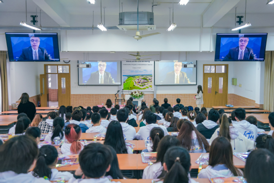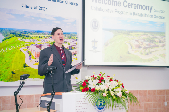 2021年11月5日,2021级康复治疗学(中外合作办学)专业美方开学典礼在日阶202教室隆重举行。由于疫情原因,美方学校的领导和老师无法亲临现场,本次外方开学典礼采用“线上+线下”的模式举行。