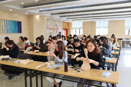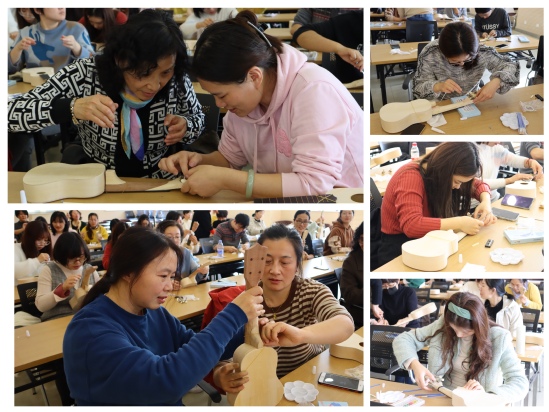 大家纷纷拿起手中的工具,细心研究桌上各个零部件,先用粘合剂将主要框架搭建成型,不一会儿功夫尤克里里的琴身就组装完成了。然后,老师们按照制作流程,着手安装琴头和琴枕,经过一番敲敲打打后,一个个调音旋钮、弦轴被固定到位。接着,老师们安装琴弦并调音,并用颜料绘制点缀琴面。制作过程中遇到问题时,大家互相帮助、交流经验,及时与指导老师进行沟通,活动气氛紧凑又欢乐。经过一番耐心装配后,一把把独一无二的尤克里里诞生了,大家都对自己亲手制作的作品感到非常满意,有的老师在现场有模有样地试弹了起来,对它爱不释手。