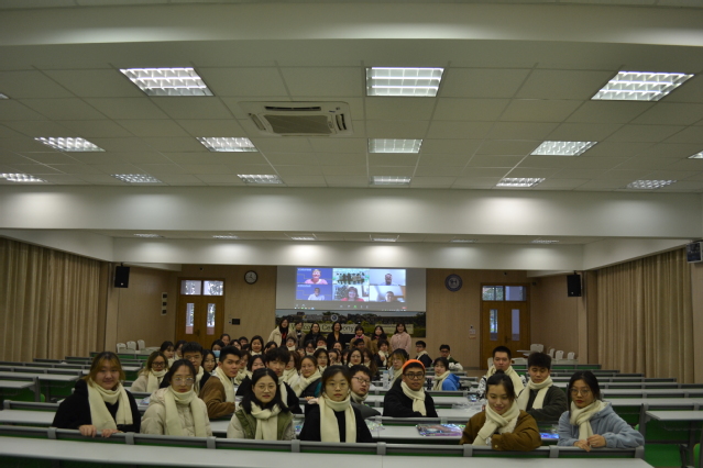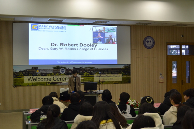2021年12月2日, 2021级国际商务专业(国际课程合作)开班仪式隆重举行,因为疫情的原因,合作院校田纳西大学查塔努加分校(The University of Tennessee at Chattanooga)的各位领导不能亲临现场,本次会议主要通过ZOOM直播的方式进行。田纳西大学商学院院长Robert Dooley、副院长Michael Jones和Kathleen K. Wheatley、系主任Katherine Karl和项目协调工作人员Peter Zhang与49名国际商务专业(国际课程合作)新生见面。我校商学院院长程葆青、国际交流处处长胡珍、副处长夏智源、老师赵诗佳及国际商务专业(国际课程合作)负责人孙艳艳及辅导员史志璇出席仪式。仪式由商学院国际商务专业薛翊老师主持。