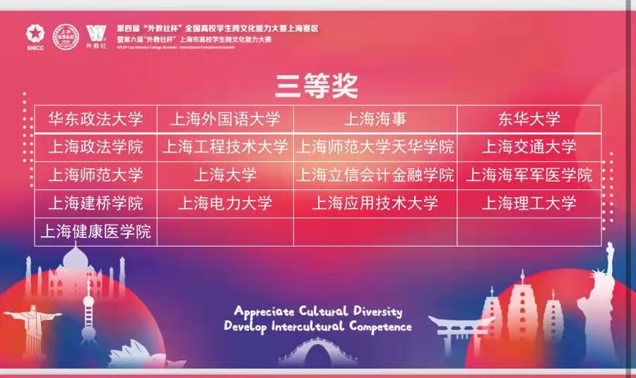2021年12月27日至28日,第六届“外教社杯”上海市高校学生跨文化能力大赛如期举行。由初等教育学院18和19级英语专业(国际课程合作)学生王婷婷、何宜倩、王怡婷三位同学组成的上海师范大学天华学院参赛队,在初教院教师陈慧美老师的悉心指导下获得大赛三等奖。