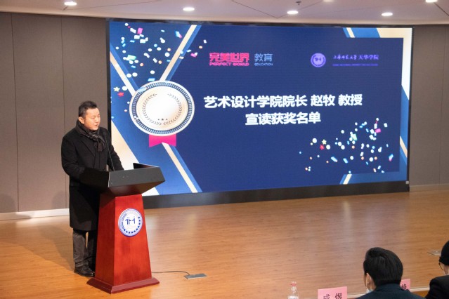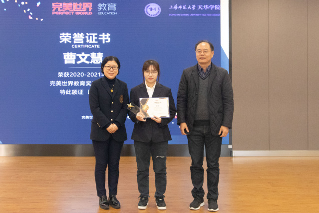 完美世界教育首席运营官刘建新女士、上海师范大学天华学院副校长王友根,党委副书记许岳分别为学生颁发了证书和奖杯。