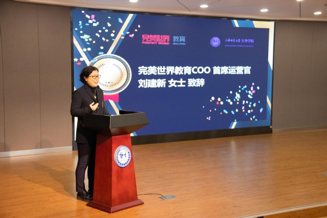 完美世界教育首席运营官刘建新女士致辞。介绍了完美世界集团在教育布局板块和在美术游戏艺术,电竞人才培养方面的成效以及学生就业规划等相关内容,并表示希望与学校进一步展开深度专业合作的强烈愿望。