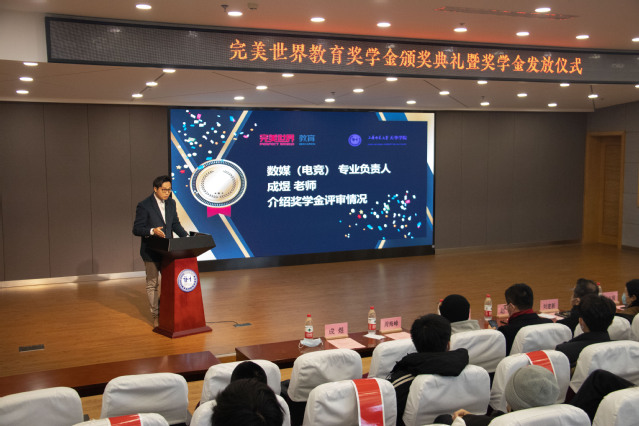 颁奖主持人刘婧老师宣布大会开始,老师们和同学们对刘建新女士的到来表示热烈欢迎。数媒(电竞)方向负责人成煜老师介绍了校企合作开展情况以及本学年奖学金评审情况,分析提出用发展的眼光看待电子竞技专业,并宣布了奖学金设置和发放情况。