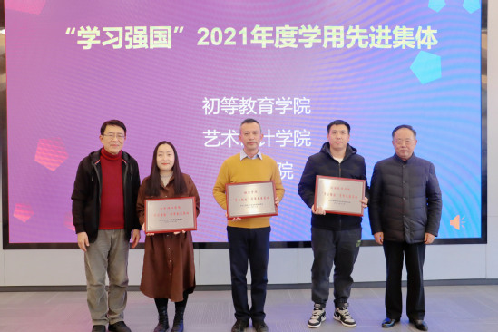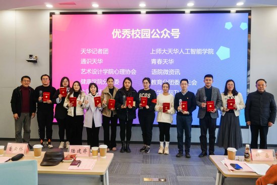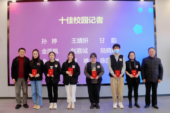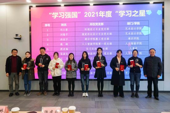 会议进入表彰环节,党委副书记许岳宣读了《关于对2021年度新闻宣传工作表彰奖励的通报》、《关于 2021 年度“学习强国”学用先进集体和个人的表彰决定》。陆建非、曹云林分别为获奖的5家新闻宣传先进集体、11名优秀新闻通讯员、9名十佳校园记者、12个优秀校园公众号、3个“学习强国”2021 年度学用先进集体以及15名“学习之星”颁发获奖证书和奖牌。陆建非还为9名新受聘的2022年度二级学院新闻通讯员颁发了聘书。