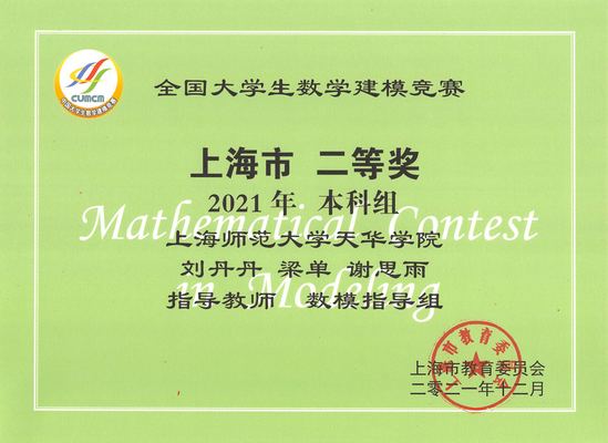 近日,2021年“高教杯”全国大学生数学建模竞赛(上海赛区)结果揭晓。由我校通识学院数学教学部指导,商学院梁单、刘丹丹,人工智能学院谢思雨三位同学组成的参赛队伍取得了本科组上海市二等奖的好成绩。