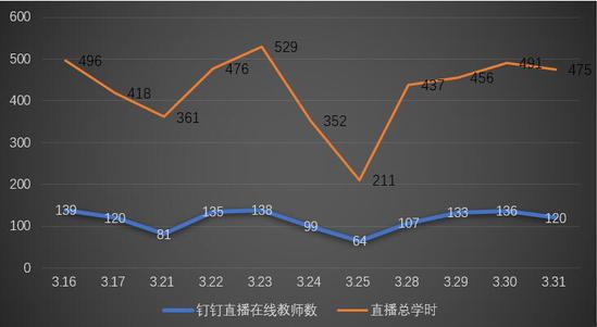 在线教学前3周(3月14日至3月31日),我校教师依托阿里钉钉系统和超星在线学习中心等平台开展教学活动,钉钉直播在线开课门数累计699门(2184门次),在线开课教师466人,校内学生4066人,校外学生5713人。截至3月31日,开展钉钉直播在线教学的教师累计1272人次,直播总学时4702学时,参加钉钉直播授课的学生累计70226人次。