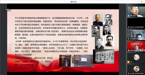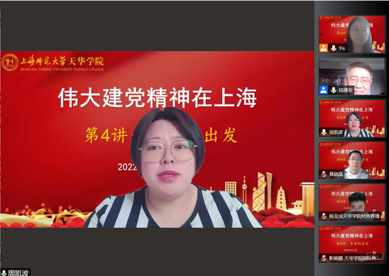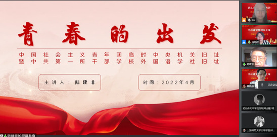 本课程《伟大建党精神在上海》的第四讲“青春的出发”,围绕中国社会主义青年团临时中央机关旧址暨中共第一所干部学校外国语学社旧址,由校党委陆建非书记讲授。因疫情原因,该讲于2022年4月12日采用腾讯线上会议形式开展,由马克思主义学院院长周凯波主持,马院全体教师及全校各学院学生代表共同聆听。