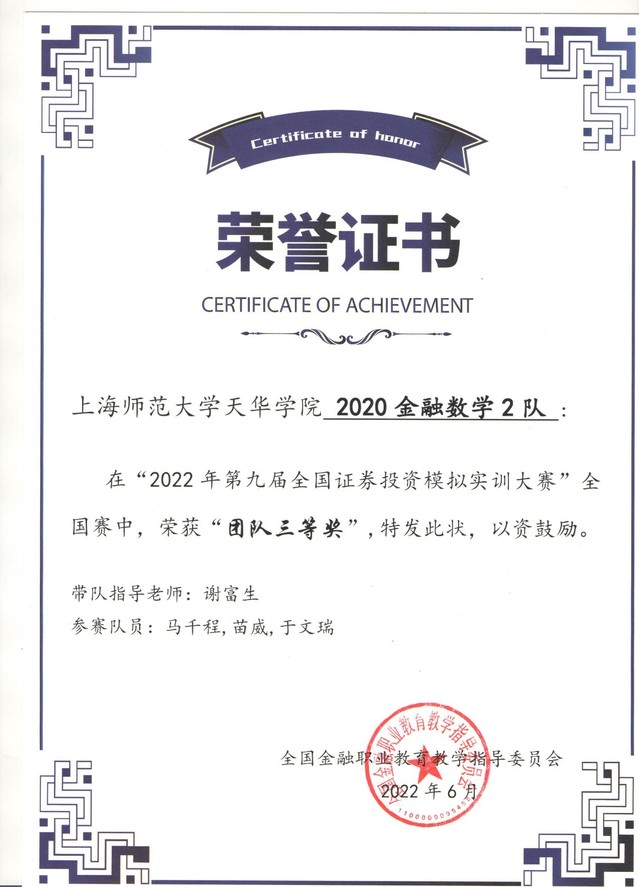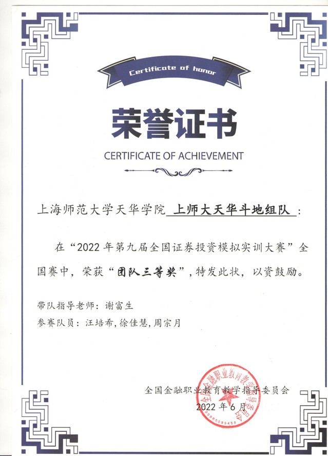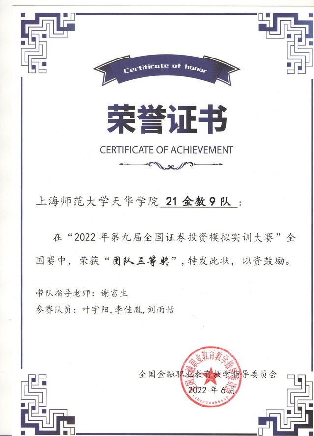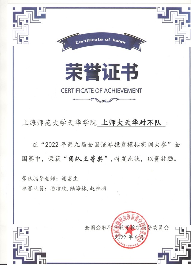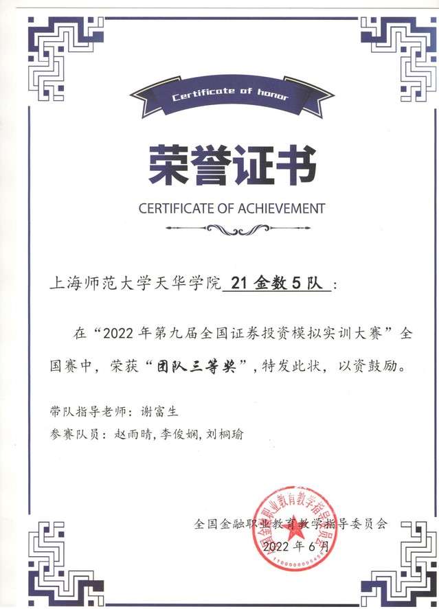 在为期3个月的2022第九届全国证券投资模拟实训大赛本次大赛中,我校谢富生老师带队,有一队(李文杰、蔡丙群、李嘉乐)获得全国二等奖,6队获得全国三等奖的好成绩。