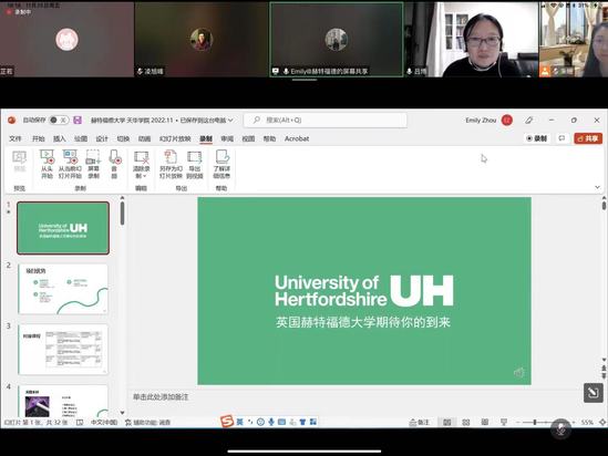 会议第二项,由University of Hertfordshire的Emily ZHOU老师为同学们介绍学校背景,合作办学经验、留学生活及升学前景。英国赫特福德大学是一座现代化的综合性大学,秉承“重就业,重实践”的教育理念,有9大学院,500多种课程,所有二级学院都有本科、硕土、博士、博士后,全校有31800名学生,3000名国际学生,拥有丰富的合作教学经验。在依次介绍了学校的荣誉学位,就业机会、国际学生服务。并向同学们展示和介绍了Hertfordshire学校的实验场地和设备,以及校内的生活场景,让参会的师生们感受Hertfordshire高校严谨专业而又温馨的学习生活氛围。