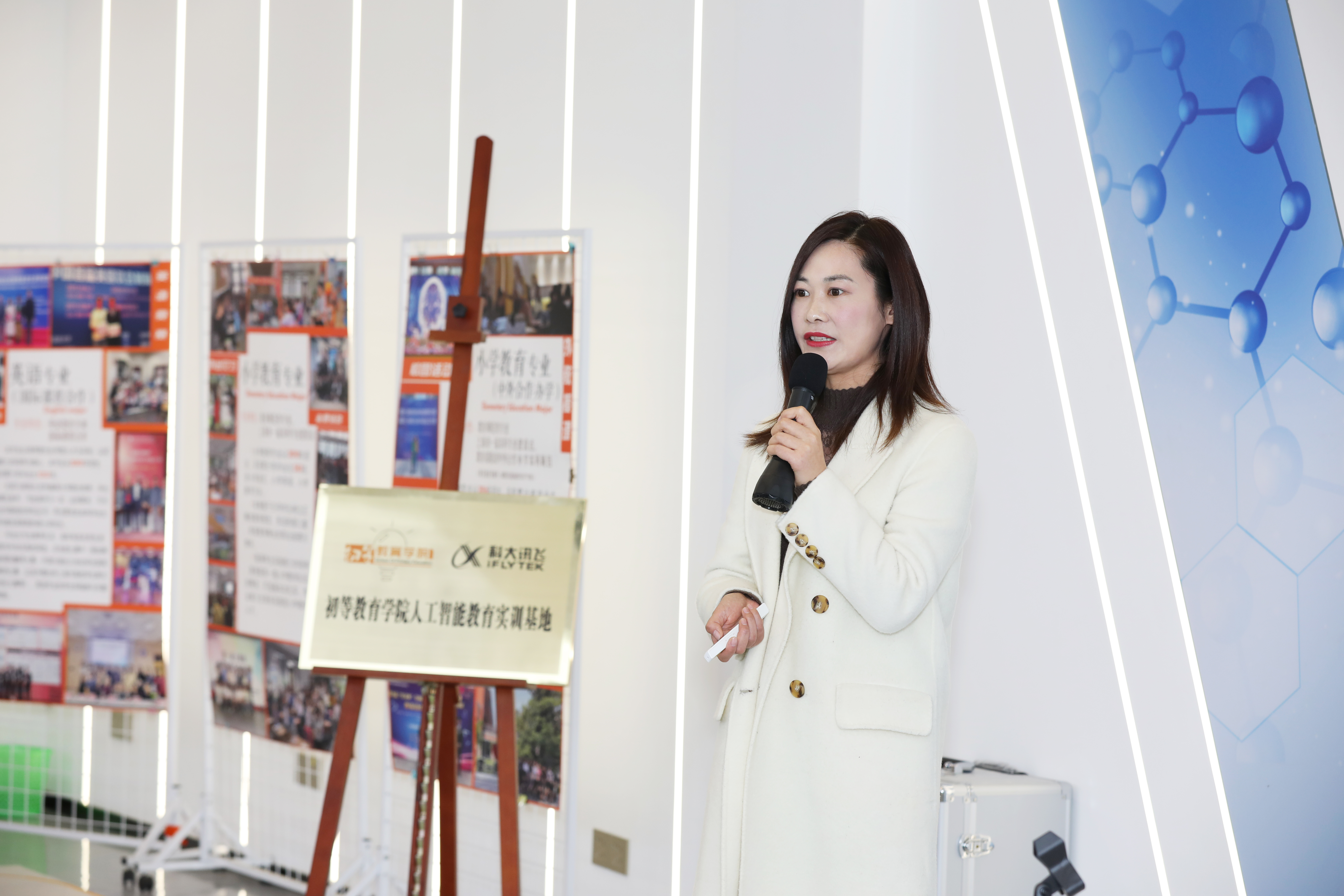 揭牌仪式后, 小学教育专业主任叶彬恩老师介绍了学院智能化的发展特色并指出小学教育专业作为上海市一流本科专业建设点,承担着培养优质小学教育师资的社会责任。初等教育学院人工智能教育实训室建设完成后,将作为智能化小学教育应用研究和课程建设创新基地,集成学校儿童教育具有的综合优势,为儿童教学管理、小学教育人工智能师资培训和家长教育提供服务,并为上海以及周边地区小学教育课程建设提供支持服务。