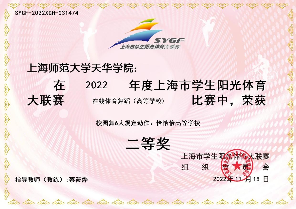 本次赛事由上海市教委、上海市体育局、共青团上海市委主办,上海市学生活动管理中心、东华大学承办,上海市大学生体育协会协办,吸引了来自复旦大学、同济大学、东华大学、华东政法大学等各高校的百余名学生参赛,各高校间竞争异常激烈,我校运动员们凭借整齐划一的动作,欢快典雅的舞姿,昂扬向上的精神得到评委的肯定,最终荣获“校园舞6人规定动作:恰恰恰高等学校二等奖”。
