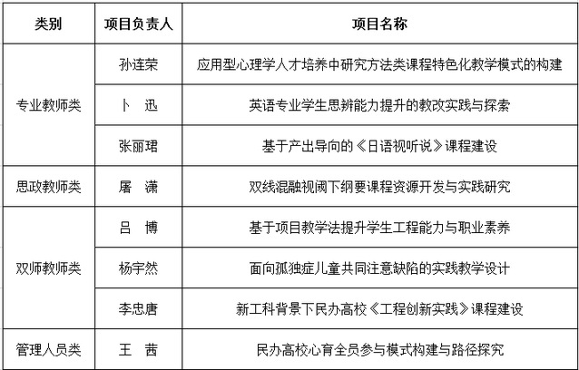 根据《上海市教育委员会上海市民办教育基金会上海市教育发展基金会关于印发<上海市民办高校“民师计划”项目管理办法>的通知》(沪教委民〔2022〕12号)和《上海市教育委员会 上海市民办教育基金会 上海市教育发展基金会关于开展2022年度“民师计划”项目申报工作的通知》(沪教委民〔2022〕20号),我校8个项目入选上海民办高校“民师计划“项目。具体名单如下: