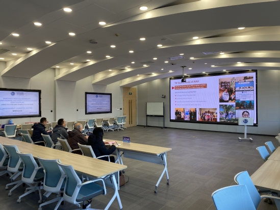 接着,天华学院国交处副处长张云老师对北亚学院项目进展做了汇报,包括两校的合作历史、机构申办历程,以及目前机构教学和管理情况。本学期北亚的两名专职外教已经开始授课,为保障学生的学习效果,每班都配有中教助教协助外教课堂管理和教学。项目启动阶段,北亚国际处以及中国中心员工联合天华学院国际交流处积极给与学生技术、学术支持与辅导。