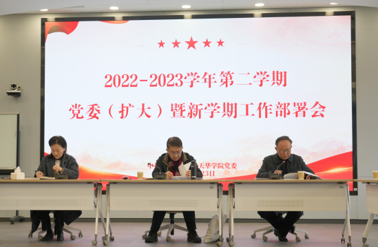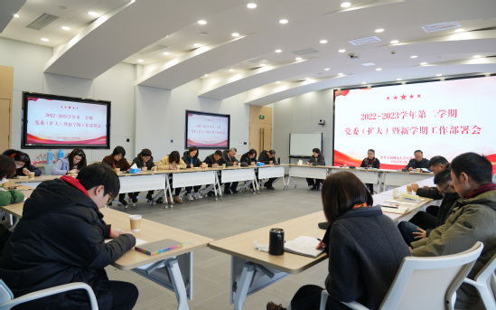 2月23日上午,学校党委在明华楼5楼远程教学中心举行党委扩大会,部署新学期工作。校党委书记陆建非,副书记曹云林、许岳,党委委员、副校长吴国兴、陈新斌,党委分管部门副处级以上干部以及各党总支书记参加会议。党办主任、宣传部长齐砚奎主持。