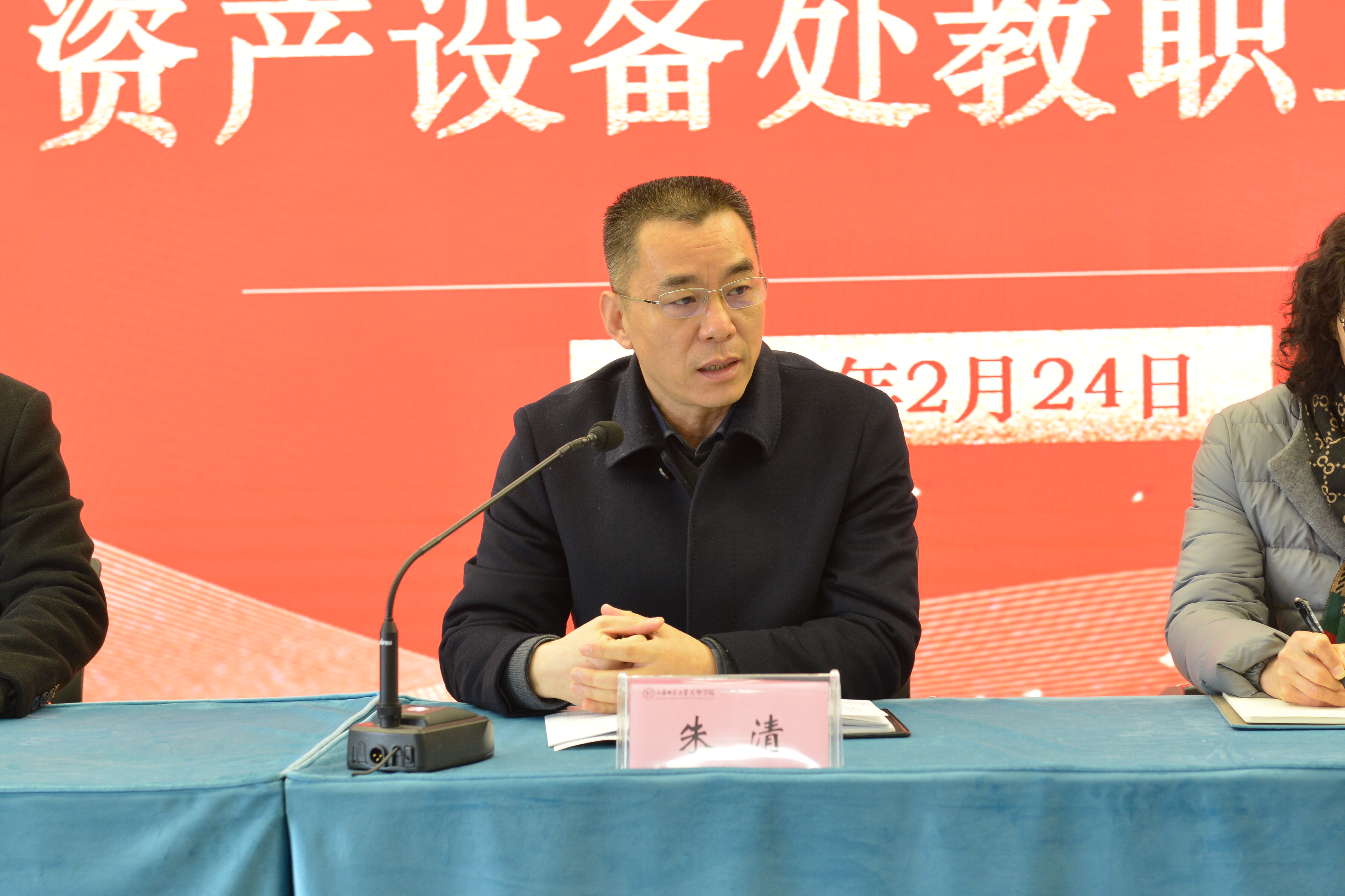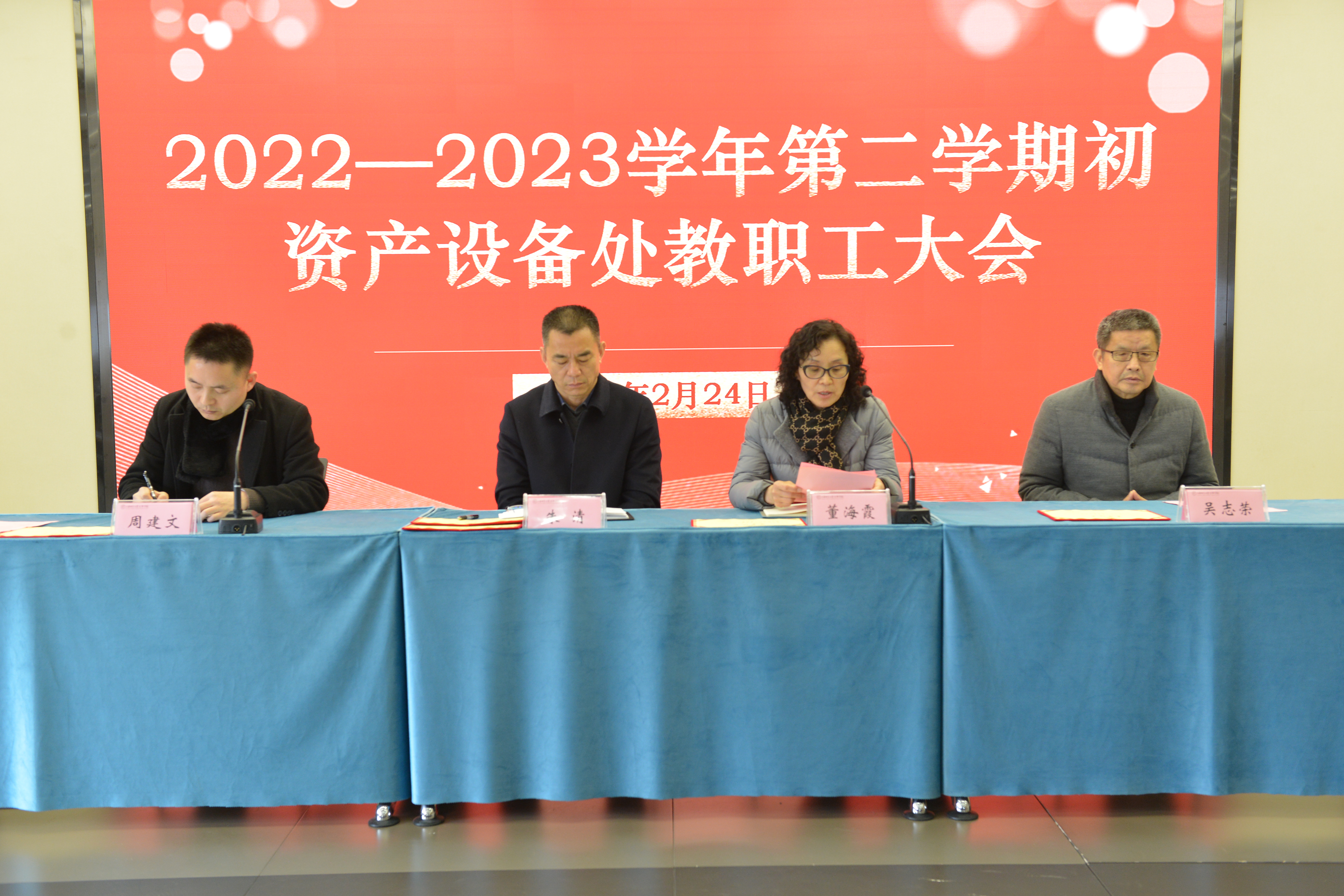 2023年2月24日下午13:00,资产设备处在图书馆报告厅组织召开新学期教职工大会,学校资产设备处处长朱清,副处长董海霞、周建文,图书馆馆长吴志荣,资产设备处全体教职工出席了大会。大会由资产设备处副处长周建文主持。