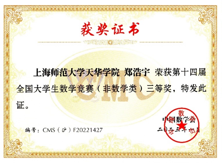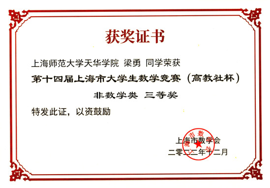 2022年11月12日,第十四届全国大学生数学竞赛在全国各赛区正式拉开序幕。此次大赛中,我校叶才福校长,副校长、通识学院院长龚春蕾等校领导的高度重视,通识学院数学教学部精心指导,学生踊跃参与。近日,大赛成绩揭晓,共有三名学生获奖,其中邬志鹏获全国三等奖,郑浩宇获全国三等奖,梁勇获上海市三等奖。