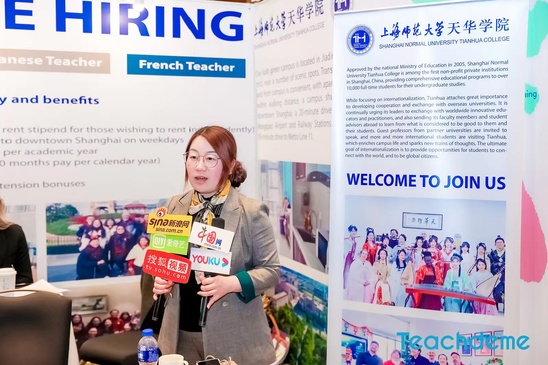 本次招聘会上,我校国际交流处副处长张云接受来自中国网、新浪网、爱奇艺、搜狐视频、优酷视频的采访,向Teachdeme线上外籍教育工作者和双语教育工作者介绍了天华学院的基本情况及招聘岗位的要求,并向符合条件的求职者发出诚挚邀请。