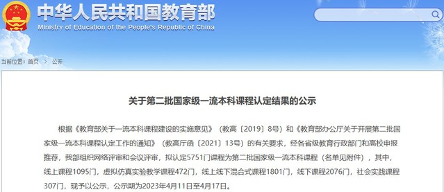 一流本科课程建设是教育部“双万计划”的重要组成部分。2019年,教育部启动一流本科课程建设工作,计划建成万门左右国家级一流本科课程和万门左右省级一流课程。根据《教育部关于一流本科课程建设的实施意见》(教高〔2019〕8号)的有关要求,入选的国家级一流本科课程要求质量高、共享范围广、应用效果好、示范性强,并能够代表我国当前本科课程的最高水平。据悉,此次教育部共认定5751门课程(线上一流课程1095门,虚拟仿真实验教学一流课程472门,线下一流课程2076门,线上线下混合式一流课程1801门,社会实践一流课程307门)为第二批国家级一流本科课程。