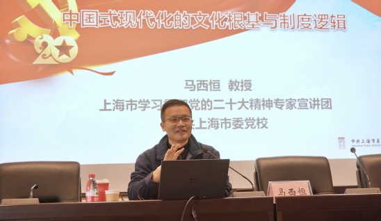 4月13日下午,学校党委在明华楼报告厅举行党的二十大精神专题报告会,邀请上海市二十大精神宣讲团成员、中共上海市委党校社会学教研部主任马西恒教授作《中国式现代化的文化根基与制度逻辑》主题报告,专题讲解中国式现代化内涵。学校党委中心组成员、二级学院党总支书记、基层党务干部、思政课教师及学生党员代表参加会议。会议由党委书记陆建非主持。