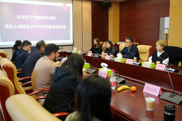 上海师范大学天华学院副校长王友根、艺术设计学院常务副院长徐子卿等专业骨干教师与天下秀教育一行在同华楼会议中心进行了校企合作交流,为当前产教融合进行了总结与沟通,同时为更好地进行校企合作,为学生提供多方位产教服务进行了深度交流。
