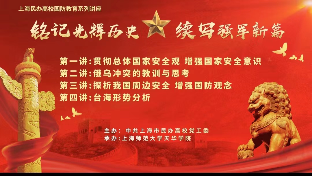 今年的4月15日是第八个全民国家安全教育日。为深入学习贯彻党的二十大精神,紧紧围绕习近平新时代中国特色社会主义思想,贯彻落实习近平总书记关于全面加强国家安全教育的重要指示精神,增强全民国家安全意识和法治意识。由中共上海市民办高校工作委员会主办组织开展“铭记光辉历史 续写强军新篇”上海民办高校国防教育系列讲座在上海师范大学天华学院大礼堂拉开帷幕。
