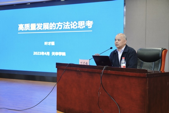 叶才福从高质量发展的定义出发,通过相关案例分享了高质量发展所带来的启示,阐明了党的二十大报告中高质量发展的概念,强调“人力、物力、财力与技术、制度、文化”几个方面共同作用的意义,最后提出技术创新的种子需要制度土壤与文化养分,而创新又是需要“体制、文化、人才、资金”四个方面的不断进取与拓新。他同时也表示自己十分期待天华的学子在未来能够成为社会的榜样,成为新时代的领航人。