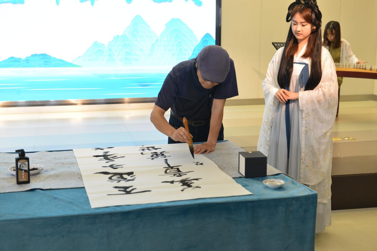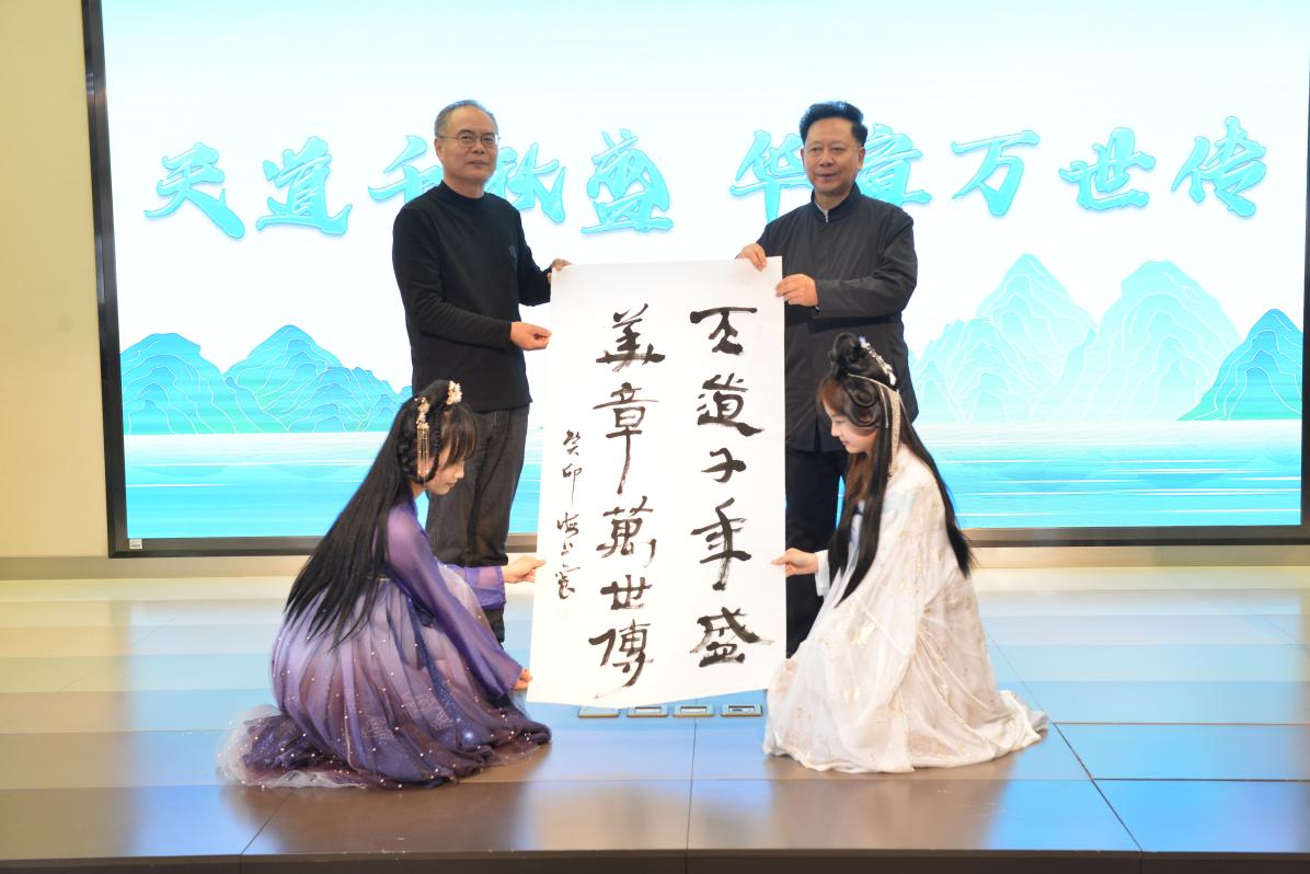 文字飘香纸墨含情,墨香与书香相得益彰。特邀嘉宾上海市著名书法家陆金良先生在优美的古筝伴奏下,写下了苍劲有力的“天道千秋盛 华章万世传”十个大字赠与天华图书馆。