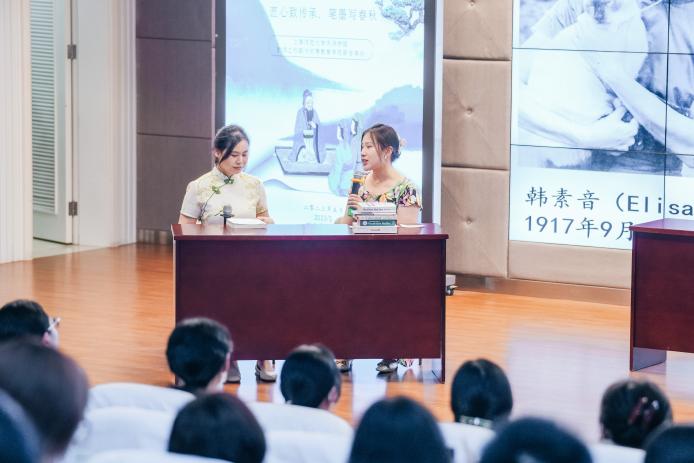 场景二:梦境邂逅许渊冲、韩素音。在这一场景中,通过英语专业教师冯恬恬在梦境中遇见翻译泰斗许渊冲和传奇作家韩素音而展开了两段对话。许渊冲先生坚持自己的热爱,教师要将先生的“择一事,专一业”作为自己的座右铭,不为繁华易匠心;韩素音女士为我院积极参与“韩素音国际翻译大赛”而深深感动,也希望后生们带着这份前辈的期许,秉持传承精神,在师为世范的道路上愈走愈远。