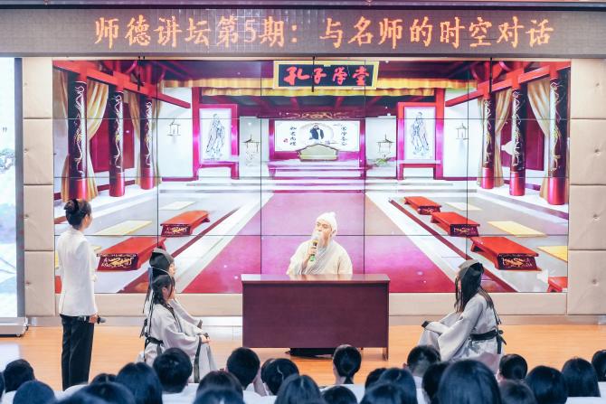 本次师德讲坛“与名师的时空对话”,教师工作部与初等教育学院携手用一种创新的视角,以师生联动的方式打造了三个不同时代的情景剧场景,通过对话、独白、师生间的深度互动等体会师德凝聚出的匠心来润物细无声,用师德榜样的力量感染人、鼓舞人、引领人,引导当代教师和即将成为教师的学生们以德立身、以德立学、以德施教、以德育德。