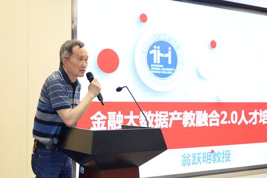 原金融科技系主任翁跃明教授分享了金融大数据产教融合2.0人才培养模式。他从历史交汇背景、服务城市宗旨、产教融合模式、探索人才培养,给出了产教融合、产学融合从1.0到2.0的飞跃,提出了新人才技能矩阵FAST,即由两个维度组成的矩阵,并就如何构建人才培养2.0生态阐明观点。