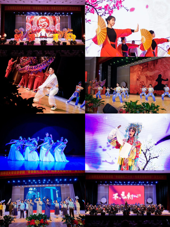本次晚会分为“古韵悠然”“华章征程”上下两个篇章,以底蕴深厚的中华文化和繁荣昌盛的祖国为基底,描绘出一幅汉风华韵的美丽画卷。现场精彩不断,异彩纷呈,舞龙、长拳、功夫扇、戏曲、相声、舞蹈、朗诵情景剧等节目轮番上演,演员们精彩的演出获得了观众们的阵阵喝彩,表达了对中华优秀传统文化的热爱,彰显了天华学子不忘初心、心怀家国的责任担当。天华管乐团、天华雅乐团演奏的《敦煌》《不忘初心》,体现了我校“活力天华”工作的成效,将中华优秀传统文化的传承与创新、美育工作的理念与格局进行融合。