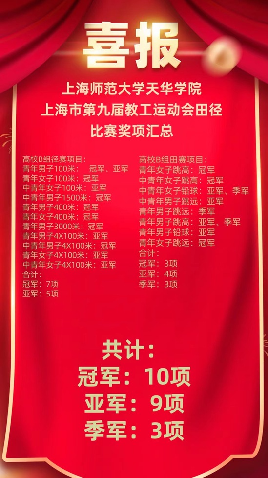 经过一天的激烈角逐和奋勇拼搏,天华代表队在比赛中势不可挡、精彩不断、捷报频传,共计获得冠军10项、亚军9项和季军3项,并以316.0分的成绩(领先第二名52.5分、第三名118.5分)勇夺教工运动会田径比赛高校B组团体总分第一名,实现“双连冠”。
