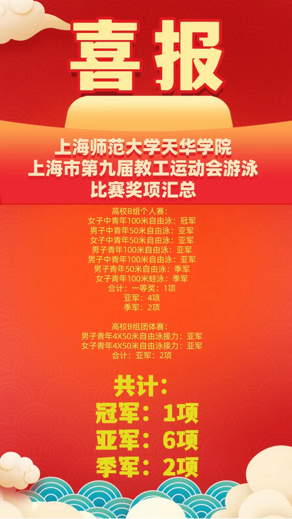 随着本次游泳比赛取得了圆满成功,至此,历时五年的上海市第九届教工运动会共17个项目均已顺利完成,圆满收官。比赛虽已结束,但是赛场上这股努力拼搏、团结进取的奋斗精神永不落幕,激励天华教职工以更加饱满的热情投入到实际工作中。今后,天华健儿将继续拼搏,为学校赢得更多的荣誉。
