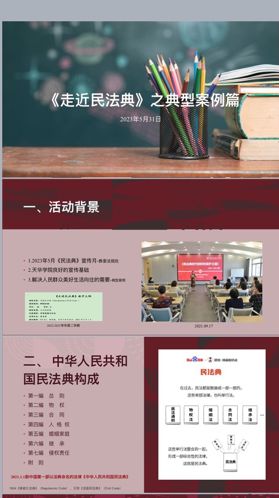 为深入学习贯彻党的二十大精神和习近平法治思想,时值民法典颁布三周年,学校举行2023年《民法典》宣传月系列活动。本次活动旨在让民法典走到大学生身边;实现美好青春,民法典相伴。