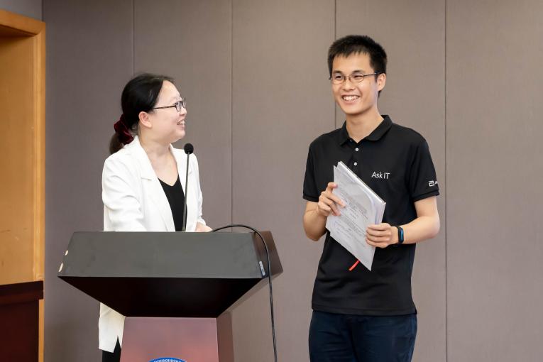 耿逸航同学的分享结束后,吕博副院长把国际交流处制作的精美的留学生毕业纪念册赠送给耿逸航同学,并且对他今天精彩的交流汇报再次表示感谢。耿逸航同学作为人工智能学院与英国赫特福德大学国际合作项目第一名留学生,能够取得如此优异的成绩,不仅是他个人,也是所有参与项目的老师们的骄傲。