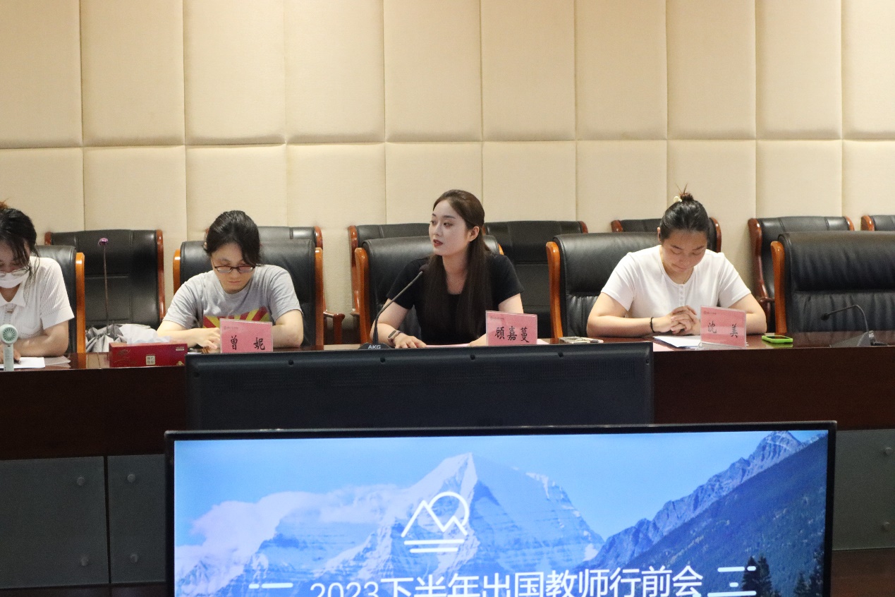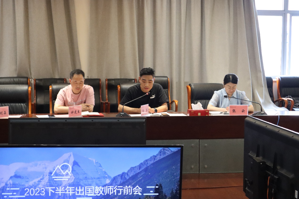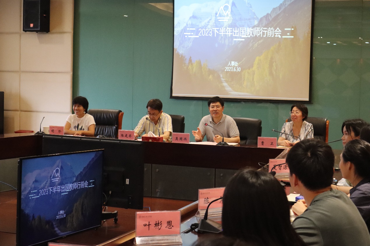 人事处常务副处长曹卫发言,希望留学教师行前配合学校完成相关服务协议的签署工作,到达海外高校后,能够尽快适应融入当地生活学习,随时与学校保持联系,定期反馈学习成果,希望老师们在异国他乡的学习生活中,大家互帮互助,共同克服困难,凝心聚力、团结力量、勇攀高峰,一起顺利完成学业。