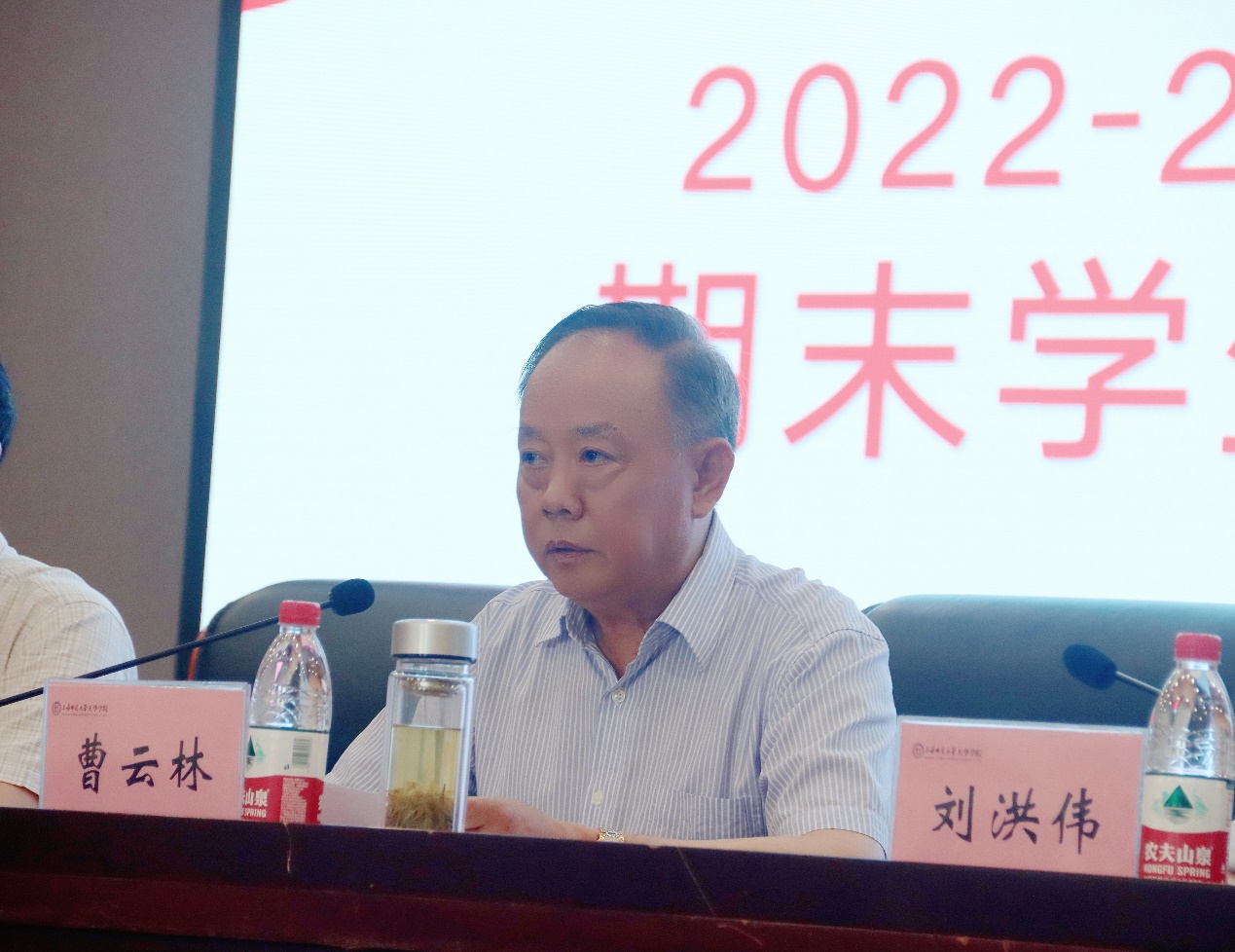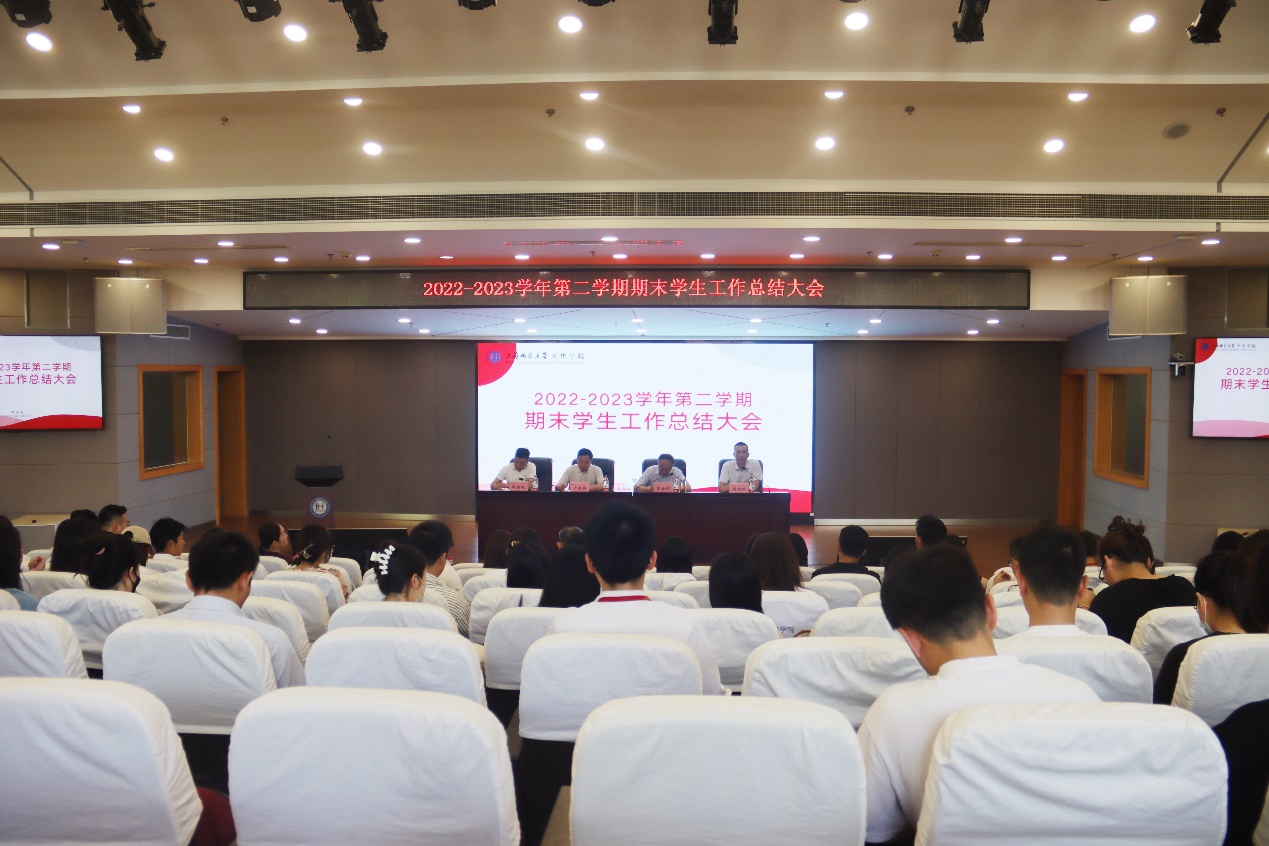 2023年7月4日上午九点,学保处在晖华楼报告厅召开2022-2023学年第二学期学生工作总结大会,对本学期学生管理各项工作进行点评总结。校党委副书记、学保处处长曹云林,校党委书记助理兼武装部部长卢建兵,学保处副处长刘洪伟、邵海波,以及各二级学院党总支正副书记与全体正副辅导员参加会议。会议由刘洪伟主持。