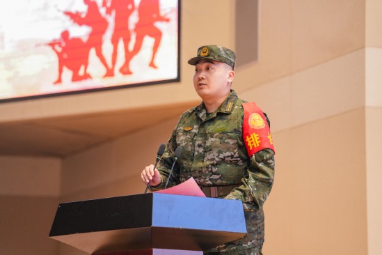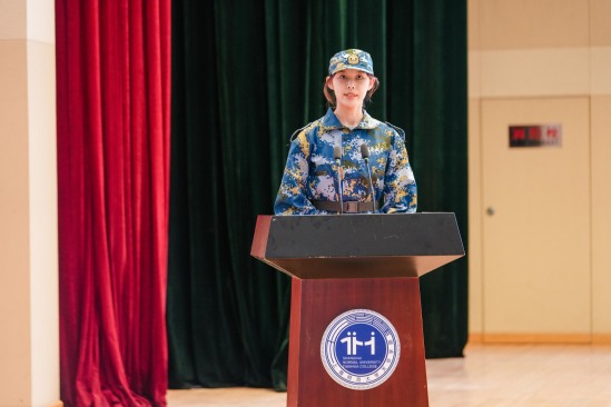 22级学前教育(中本贯通)1班沈黄佳怡同学作为参训学员代表做出承诺,表示全体参训学生将尊重教官、严守纪律,严格训练、顽强拼搏,为做人而学习、为国防而训练。承训教官代表梁巍瀚在发言中表示,全体参训教官将以高昂的热情投入到此次军训中,树军人良好形象,展部队过硬作风,做到科学组训、文明施训,确保军训任务高标准、高质量完成。