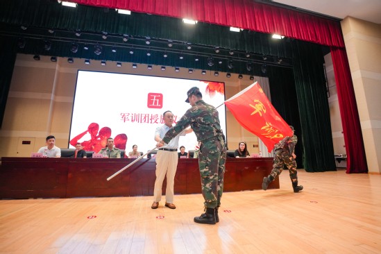伴随着迎国旗仪式,军训动员大会在庄严的国歌声中开幕。学校党委书记助理、武装部部长卢建兵宣读军训团编制机构。学校党委副书记、学保处处长、军训团副团长曹云林向军训团授予军训团团旗,火热的军训工作此刻扬帆起航。