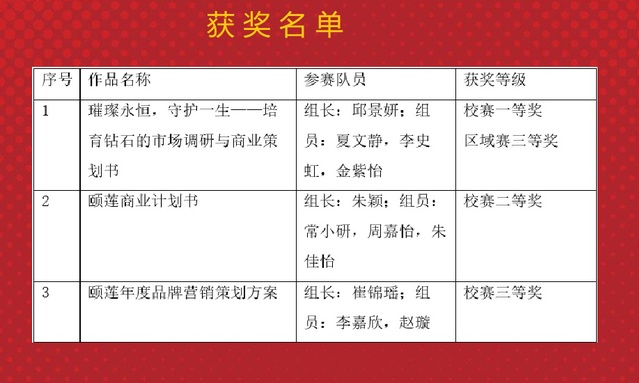 在校赛环节,经过企业调研、设计问卷、问卷调查、数据分析、报告撰写等环节,三支队伍成功提交了作品,进入到校内选拔赛环节。担任本次校赛匿名评审评委的是国际商务专业指导教授赵昌平老师、商学院副院长蒋亚萍老师和国际商务专业党秀静博士。最后,专业团队的作品“颐莲年度品牌营销策划方案”荣获三等奖,干饭不想排队的作品“颐莲商业计划书”荣获二等奖,玫什么卜队的作品“璀璨永恒,守护一生——培育钻石的市场调研与商业策划书”荣获一等奖并推荐参加全国东部区赛。
