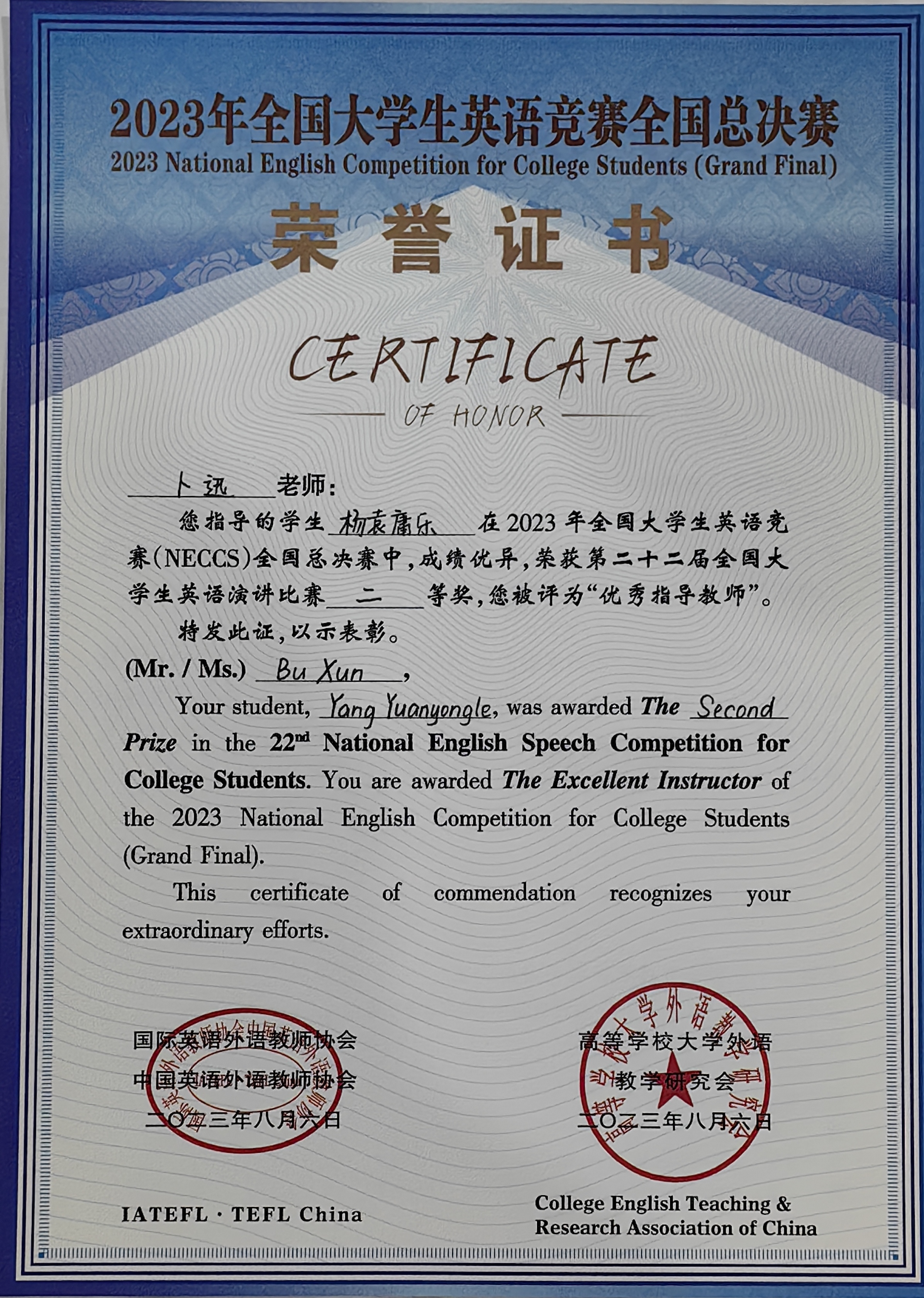2023年全国大学生英语竞赛(NECCS)全国总决赛于8月在宁夏银川市落下帷幕。由我校初等教育学院卜迅老师指导的2022级英语(国际课程合作)2班杨袁庸乐同学在此次全国总决赛中喜获佳绩,获得英语演讲比赛全国二等奖、英语风采大赛全国二等奖,同时还被评为本届赛事“优秀主持人”及“优秀参赛选手”。