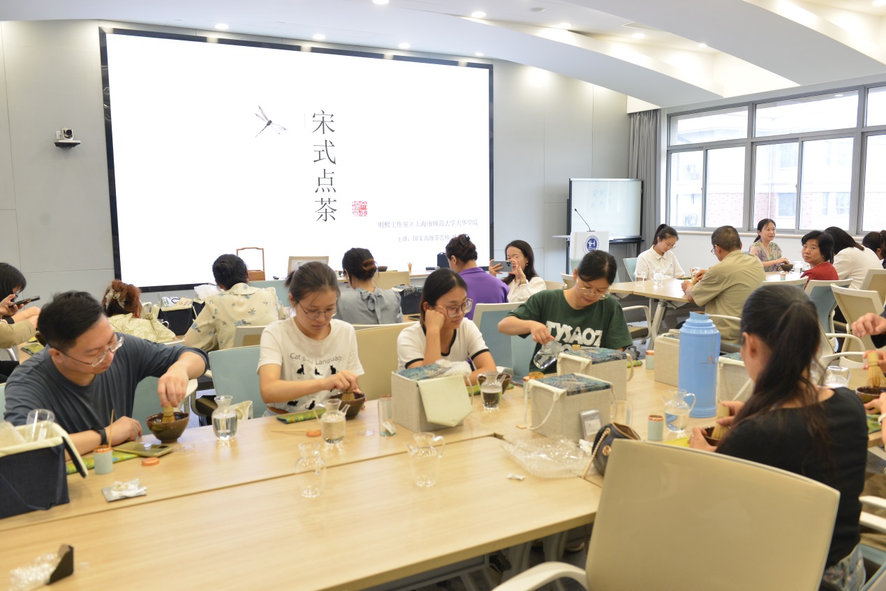 在点茶阶段,许中翾向教职工们传授了点茶的步骤和需要注意的事项,教职工们认真倾听并专心体验点茶的乐趣。运用灵活的手腕,依次完成温盏、软化茶筅、点茶等步骤,使茶汤逐渐产生丰富的泡沫,进而在泡沫上进行绘画,成品茶汤散发着浓郁的茶香,教职工们也从中尽情享受着品茶带来的轻松和愉悦。