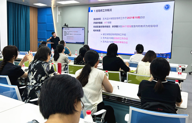 首先,艺术设计学院常务副院长徐子卿从二级学院层面围绕班导师工作概况、工作制度、工作考核等方面进行介绍。在充分论证和调研的基础上,艺术设计学院于2021年正式启动班导师制度,从最初少量班级试点到后期所有班级100%覆盖,学院以班导师工作为抓手,逐步形成了班导师与正副辅导员多维度分工协作的管理新局面;为了使班导师工作规范化、制度化,艺术设计学院逐步建立健全了班导师工作制度,明确工作职责和具体工作要求,并制定了班导师考核方案,全方位助推班导师工作提质增效。随后,艺术设计学院顾庆老师从一线班导师视角,结合带班实例,分享了班导师工作的经验和感悟,介绍了陪伴学生成长成才的育人故事。