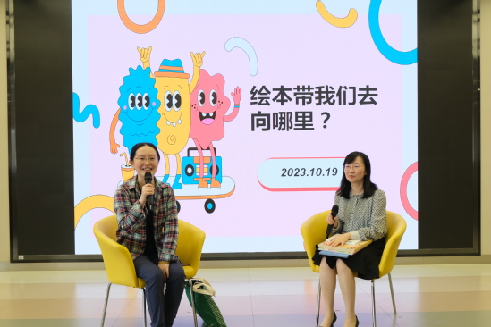 接下来,两位老师以朋友聊天的方式侃侃而谈,分享和对话中逐步展开各自对绘本阅读的理解和探索。赵琼老师补充了关于绘本的开本、构图、文图关系、画面的视觉性呈现、人物的转变、人物与自然的关系、主题的多义性、情节内容的奇遇模式、儿童读者的反应、成人和儿童共读的方式和可能等等话题,涉及到对绘本解读的方方面面。朱博老师也进一步分享了女儿的绘本作品,以及孩子们充满想象力的儿童诗歌,两位老师还就绘本对孩子的审美影响、孩子对绘本的理解性输出、自制绘本、儿童诗歌创作等重要话题进行了深入的交流与对话。
