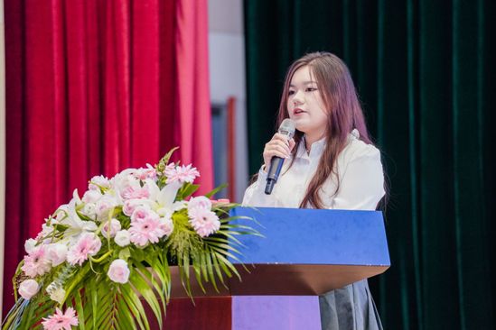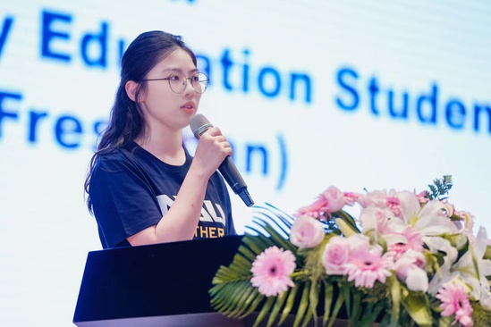 最后,来自2023级小学教育(中外合作办学)专业1班的季雯馨作为新生代表进行了掷地有声的英文发言。她认为,成为 NAU 的一名学生是一笔巨大的财富,珍惜这个机会是极其重要。出国学习一年不仅可以拓宽学生的视野,增强学术知识和能力,同时也是缩小文化差距的绝佳机会。流利的英文和极强的自信心感染着在场的每一位同学和老师。