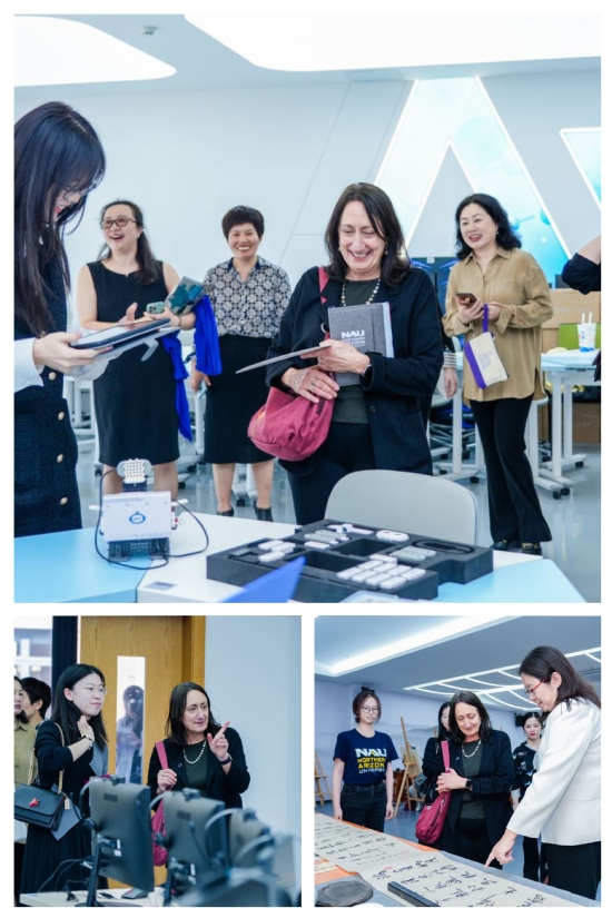随后,在学前教育学院费知行和初等教育学院柴豪頔两位老师和学生代表的带领下,Dr. Karen Pugliesi和Dr. Yimin Wang参观了学校校园以及科大讯飞教室、书法教室和语音教室。一行人对兼具古朴美感和现代化的教室表达了由衷的赞美。