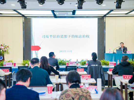 市教委政策法规处郁能文处长从法治视野下全面解读党的二十大精神、站在习近平新时代中国特色社会主义思想前沿开展依法治校的实践性阐释、联系新时代民办高校高质量发展中的经典性实践案例,引导学员紧跟新时代民办高等教育进路、牢牢把握社会主义公益性办学方向,推动新时代民办教育高质量发展,报告会形象生动、引人入胜。