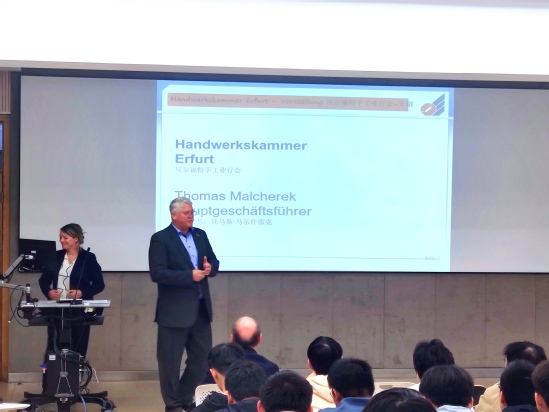 随后由德国埃尔福特手工业行会总裁Thomas Malcherek先生讲话。他首先向天华学院的热情周到的安排表示感谢,无论是入校的德语欢迎标语,还是德语议程都让他感受到了天华的合作诚意。随后他向大家介绍了HWK的基本情况,留学生在HWK可以接受专业的,系统性的理论与实践教育,并且提供先进优异的学习实践操作环境。Thomas Malcherek先生还介绍了HWK对于年轻人职业发展的重要性,HWK职业培训证书在德国,中国,乃至全球,都被汽车等工业产业届广泛认可,通过为期11个月的培训,同学们在无论是在实践操作能力,还是未来学习和就业认可度都可以获得极大的提升。他的分享不仅丰富了大家对HWK的了解,也为在座的学生们提供了一个全新的国际化视角,为同学们开拓了更多的职业发展可能性。