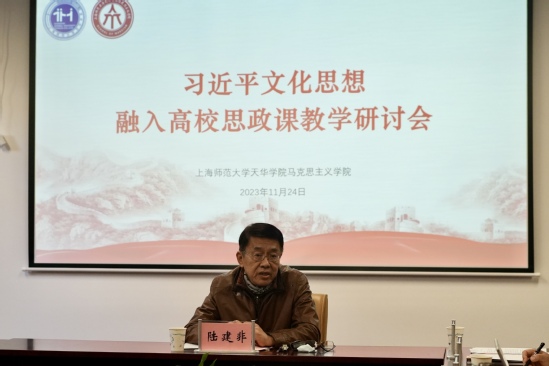 为深入学习贯彻习近平文化思想,坚持用习近平新时代中国特色社会主义思想铸魂育人,2023年11月24日,马克思主义学院举办 “习近平文化思想融入高校思政课教学”学术研讨会。上海师范大学天华学院党委书记陆建非出席会议并致辞。会议特邀上海工程技术大学马院教授吴超,上海外国语大学贤达经济人文学院马院院长朱秋,上海杉达学院马院院长游昀之,上海建桥学院马院院长宋艳华,上海立达学院马院院长王杰,上海视觉艺术学院马院院长魏志强,上海东海职业技术学院马院院长龙燕,上海科技职业学院马院院长王依娜等7所公民办马院教师出席,由马克思主义学院院长周凯波与副院长丁彩霞主持,我校通识学院副院长聂晓晶、马院指导教授胡训珉及马院全体教师共同出席会议。