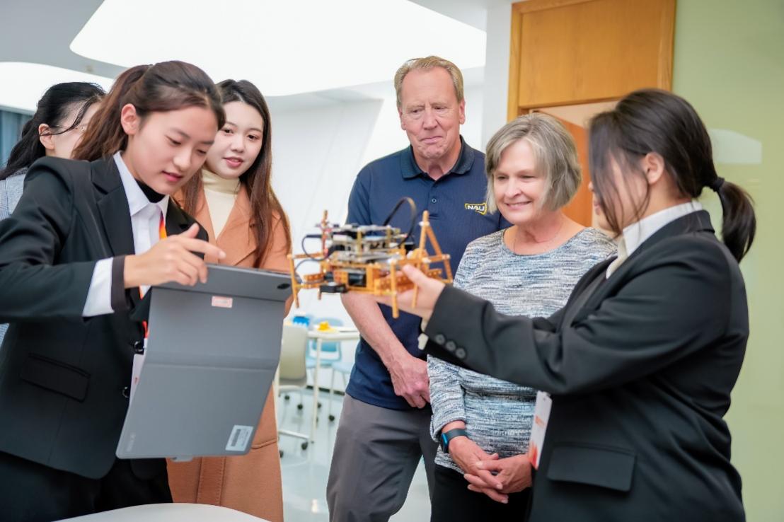 (“人工智能宣讲团”学生志愿者为嘉宾们展示各类机器人的操作和应用)